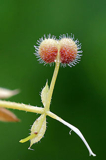 "Galium aparine", with common names including cleavers, clivers, catchweed, robin-run-the-hedge, goosegrass,and sticky willy, is an annual, herbaceous plant of the family Rubiaceae.