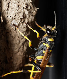 Black and yellow mud dauber is a common name for the sphecid wasp species "Sceliphron caementarium". They are solitary insects that build nests out of mud, in sheltered locations, frequently on man-made structure such as bridges, barns, open porches or under the eaves of houses.