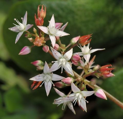 "Crassula ovata" is a succulent plant with small pink or white flowers that is native to the KwaZulu-Natal and Eastern Cape provinces of South Africa, and Mozambique; it is common as a houseplant worldwide.