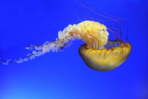 Sea nettles have a distinctive golden-brown bell with a reddish tint. The bell can grow to be larger than one meter in diameter in the wild, though most are less than 50 cm across. The long, spiraling, white oral arms and the 24 undulating maroon tentacles may trail behind as far as 10 feet. For humans, its sting is often irritating, but rarely dangerous.