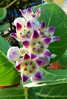 Calotropis procera (known by the common names calotrope, apple of Sodom, Sodom apple, mudar, or osheror stabragh) is a species of flowering plant in the dogbane family, Apocynaceae, that is native to North Africa, Tropical Africa, Western Asia, South Asia, and Indochina. It is commonly known as apple of Sodom, a name derived from the Hebrew Tapuah Sdom. The green globes are hollow but the flesh contains a toxic milky sap that is extremely bitter and turns into a gluey coating resistant to soap.