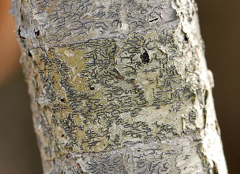 Phaeographis inusta Small fruiting bodies that radiate in a star-like pattern on the thallus.<br />