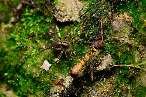 A few 5:1 macro shots of the male of Pardosa saltans. I took one home from a hike where they were running around on the forest floor in large numbers. I sacrificed it.